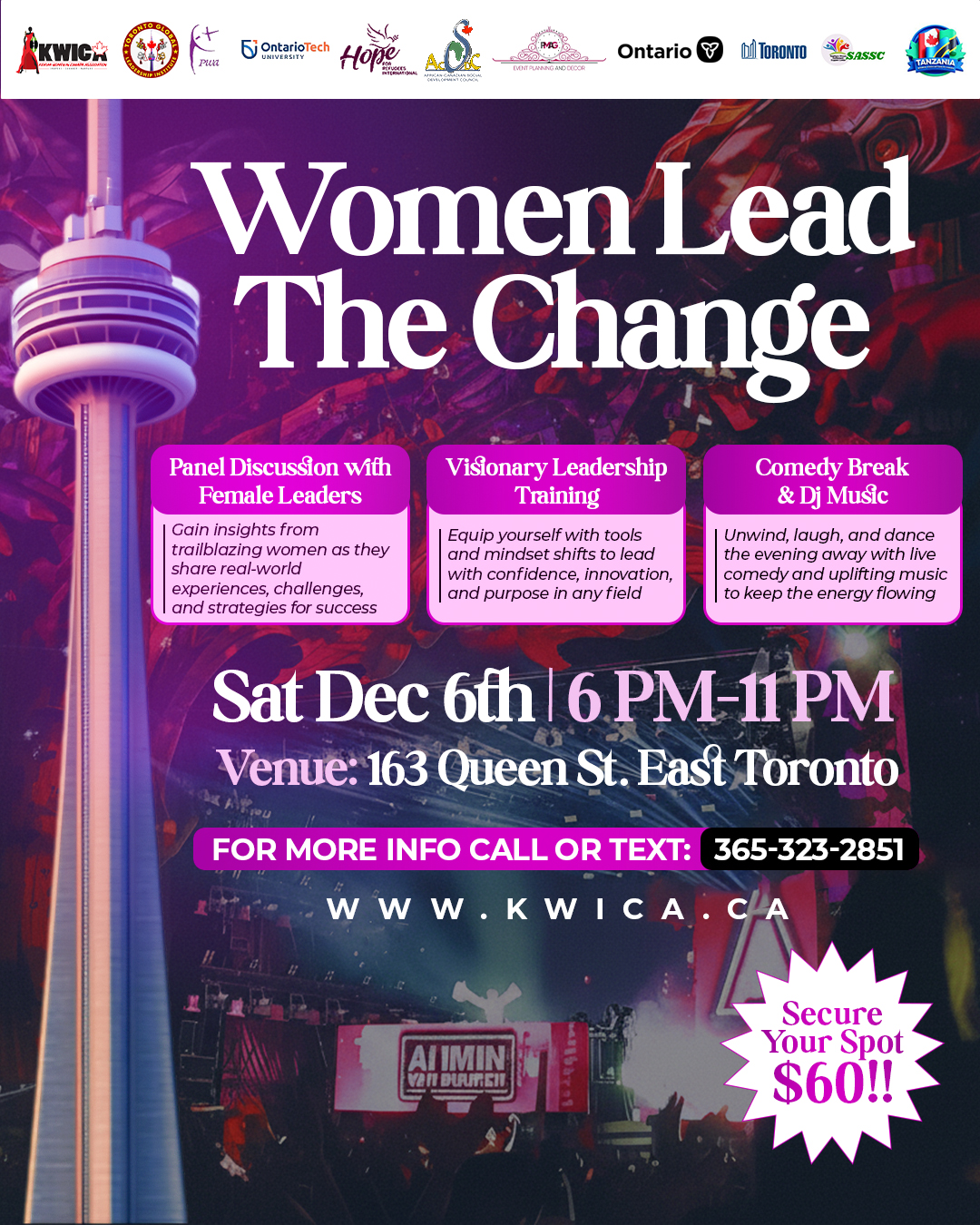 Join us on Saturday, December 6th, for Women Lead the Change, a dynamic empowerment event designed to inspire, uplift, and equip Kenyan women across the GTA and beyond. This unforgettable evening features a powerful panel discussion with female leaders, engaging visionary leadership training, and a vibrant comedy and DJ session to keep the energy high. Hosted at 163 Queen St. East, Toronto, the program offers real-world insights, transformative mindset tools, and a joyful community atmosphere where women can connect, learn, and celebrate their journey. Secure your spot today and be part of an empowering night dedicated to leadership, confidence, and positive change.